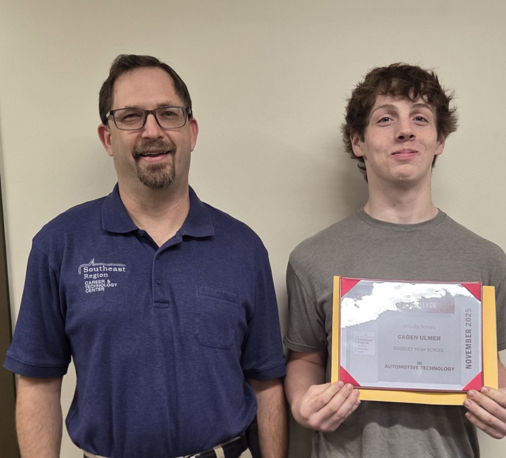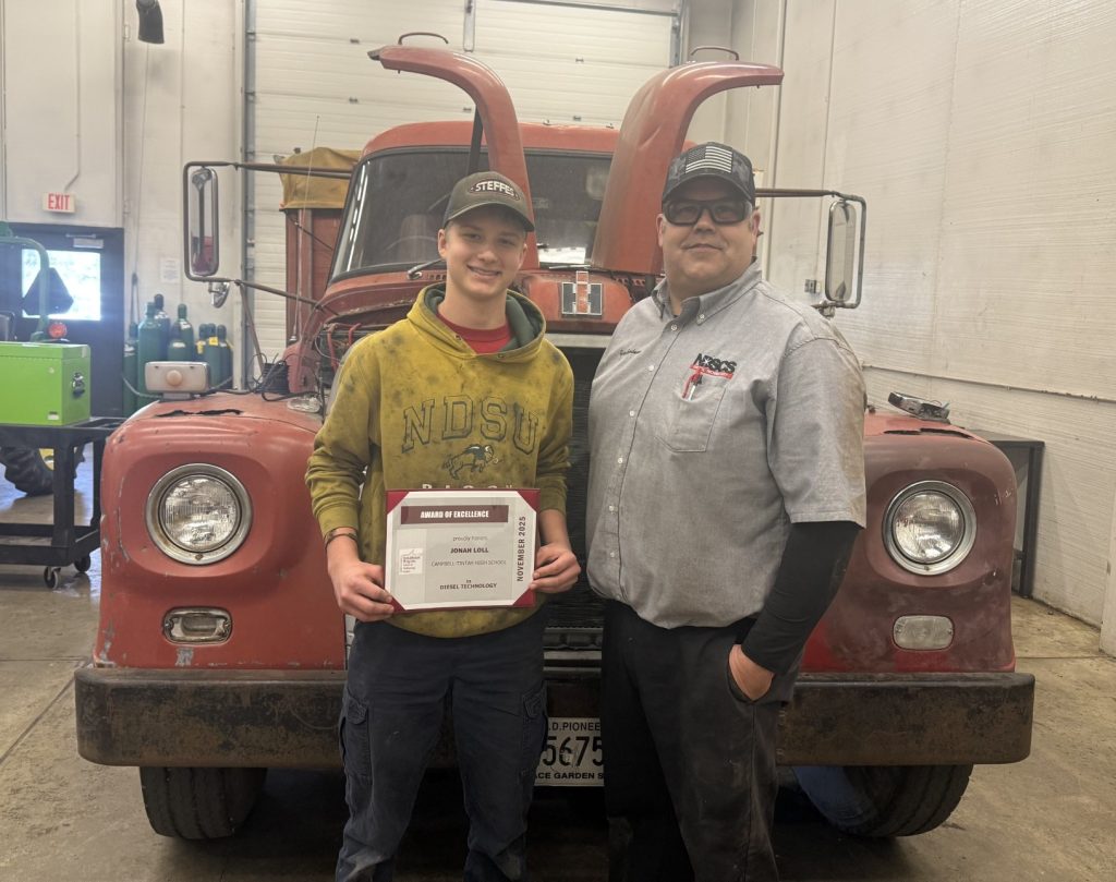 Our Student Award of Excellence winners for November are Caden Ulmer and Jonah Loll. Caden is a senior at Edgeley High School and is currently enrolled in Automotive Technology and Ag III. He is the son of Maurus and Nicole Ulmer of Edgeley. Jonah is a junior at Campbell-Tintah High School and is currently enrolled in Diesel Technology I at NDSCS through SRCTC . He is the son of Ben and DeAnn Loll of Campbell.